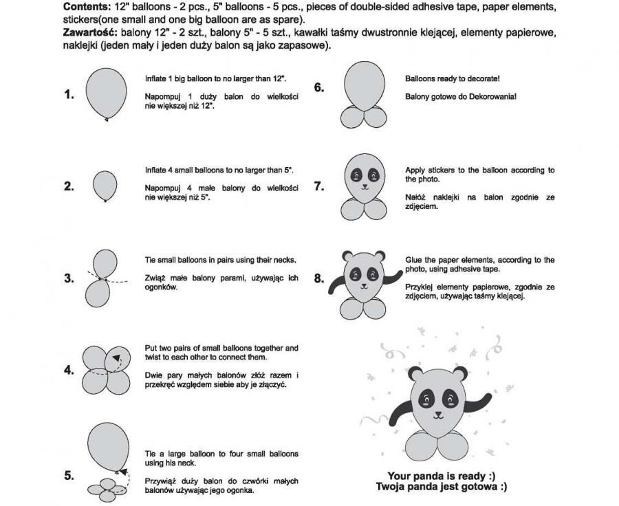 Balonkové zvířátko DIY - Panda je kreativní a zábavný doplněk pro každou dětskou oslavu nebo jen jako aktivita pro děti. Balení obsahuje vše potřebné pro vytvoření veselého Pandy z latexových balonků a samolepek. S pomocí přiloženého návodu si zvířátko snadno a rychle vytvoříte.