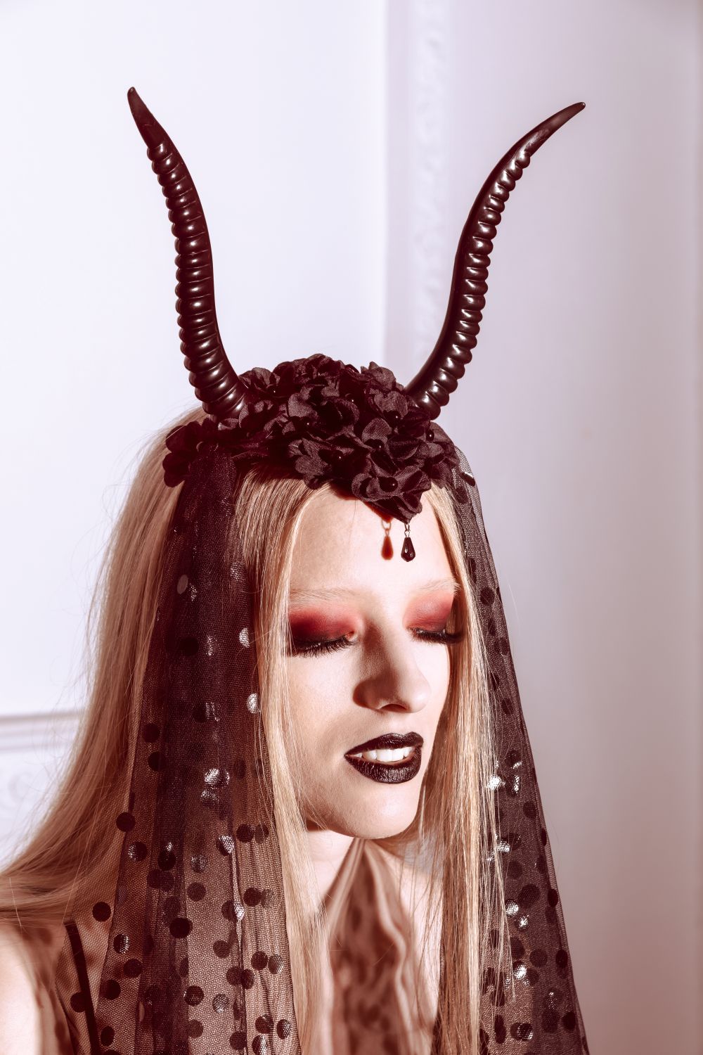 Mini čarodějnický klobouk na černém pásku s brokátově fialovou pavučinou, zdobený saténovou stuhou. Čelenka se hodí jako doplněk k čarodějnickému kostýmu na karneval, halloween a nebo čarodějnickou party.
