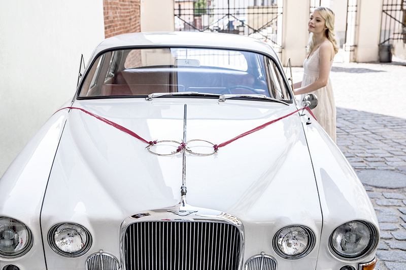Sada ozdob na auto v bílé barvě, vyrobeno z ratanu, sada obsahuje: 2 spojené kroužky se stuhami (průměr cca 18 cm, délka stuhy cca 2,20 m) a 4 ozdoby na kliku (průměr cca 8 cm, délka cca. 1,38 m).