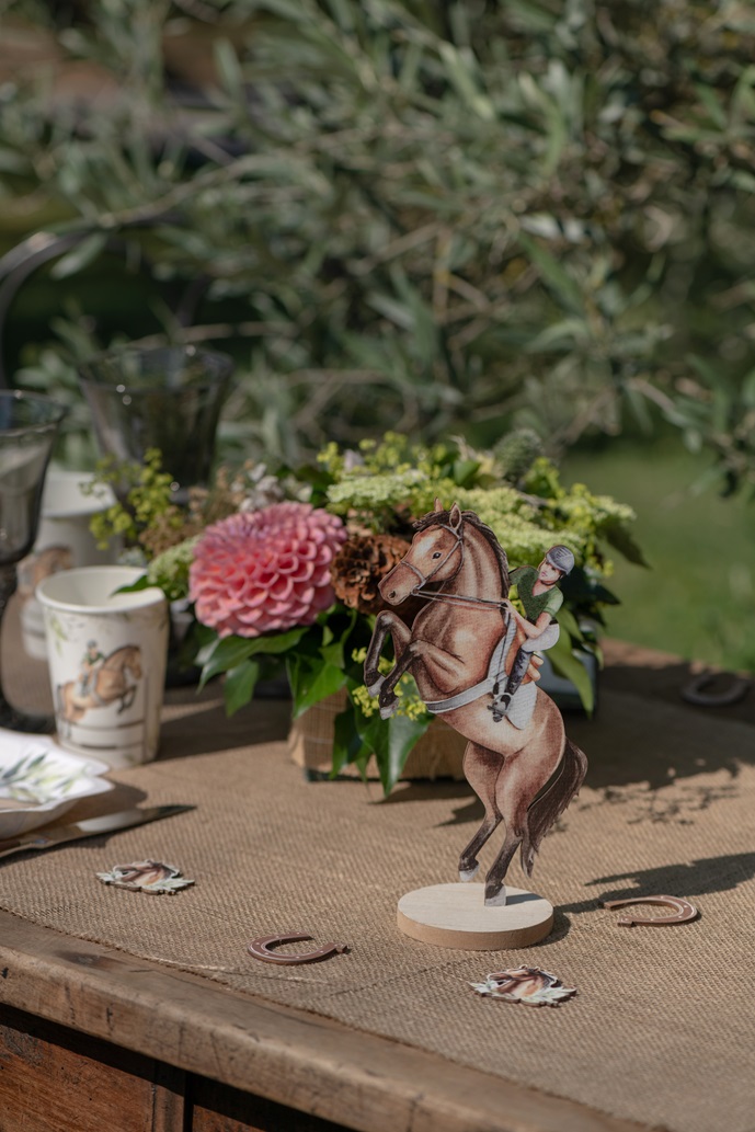 Dekorace na stůl s dřevěným podstavcem v motivu závodního jezdce na koních, hodí se na oslavu narozenin nebo tématickou párty. Skvělý doplněk na stůl, který přidá hodnotu vaší oslavy.