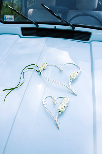 Ratanová srdce s jemným zeleným zdobením jsou ideální svatební dekorací na auto. V sadě najdete 2 kusy, které snadno připevníte k vozidlu díky připraveným očkům.
