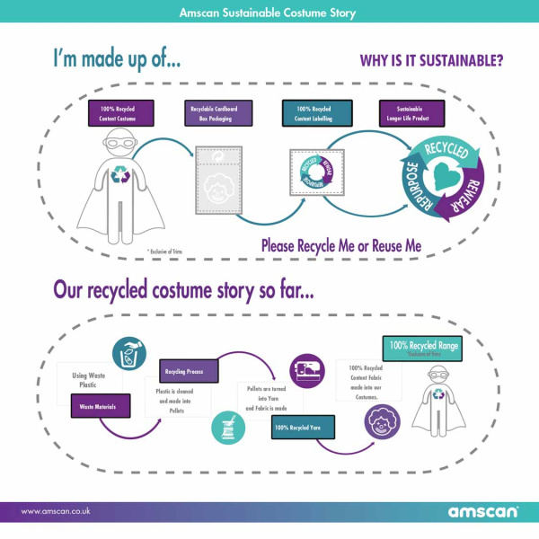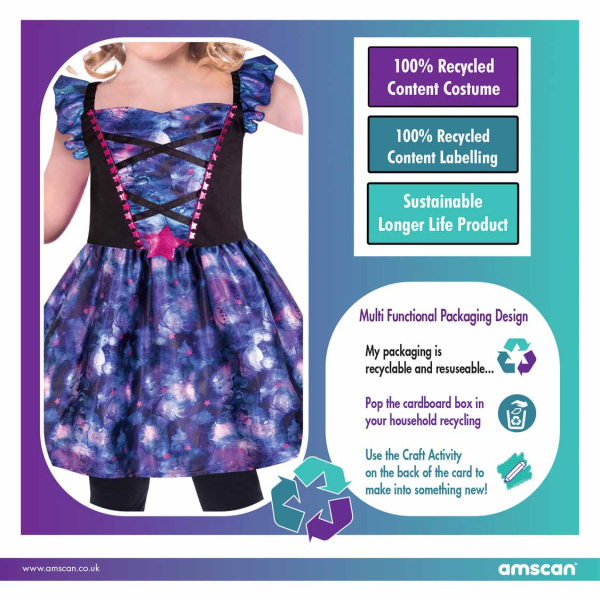 Kostým čarodějky vyrobený 100% z recyklovatelného materiálu. Neobsahuje glitry a lze jej prát v pračce. Hodí se jako převlek na Halloweenskou party, karneval, oslavu narozenin nebo pro každodenní převlékací hry!
