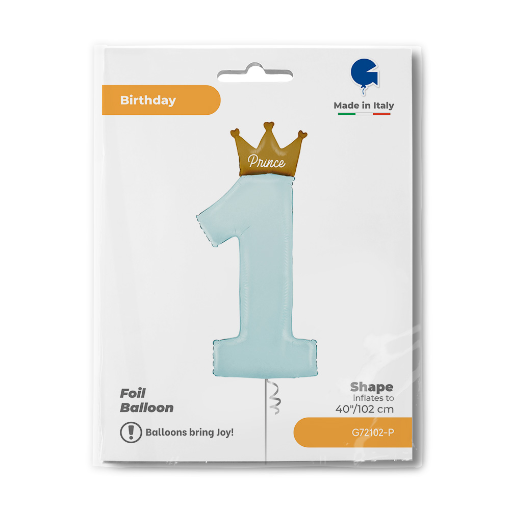 Foliový balonek ve tvaru číslice jedna v modré barvě a ozdobený zlatou korunkou s nápisem Prince. Tak to je jasná volba pro výzdobu prvních narozenin vašeho malého prince. Balonek lze nafouknout klasicky vzduchem, ale i heliem a létá pak opravdu dlouho. Jeho velikost je 42 x 102 cm.