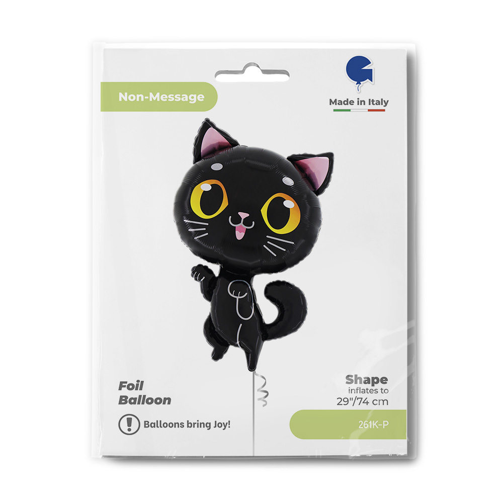 Fóliový balonek ve tvaru roztomilé černé kočky – Black Cat se skvěle hodí na dětské oslavy, halloweenskou party nebo jako milý dárek pro milovníky koček. Balonek lze nafouknout vzduchem i héliem, rozměry 72×45 cm.