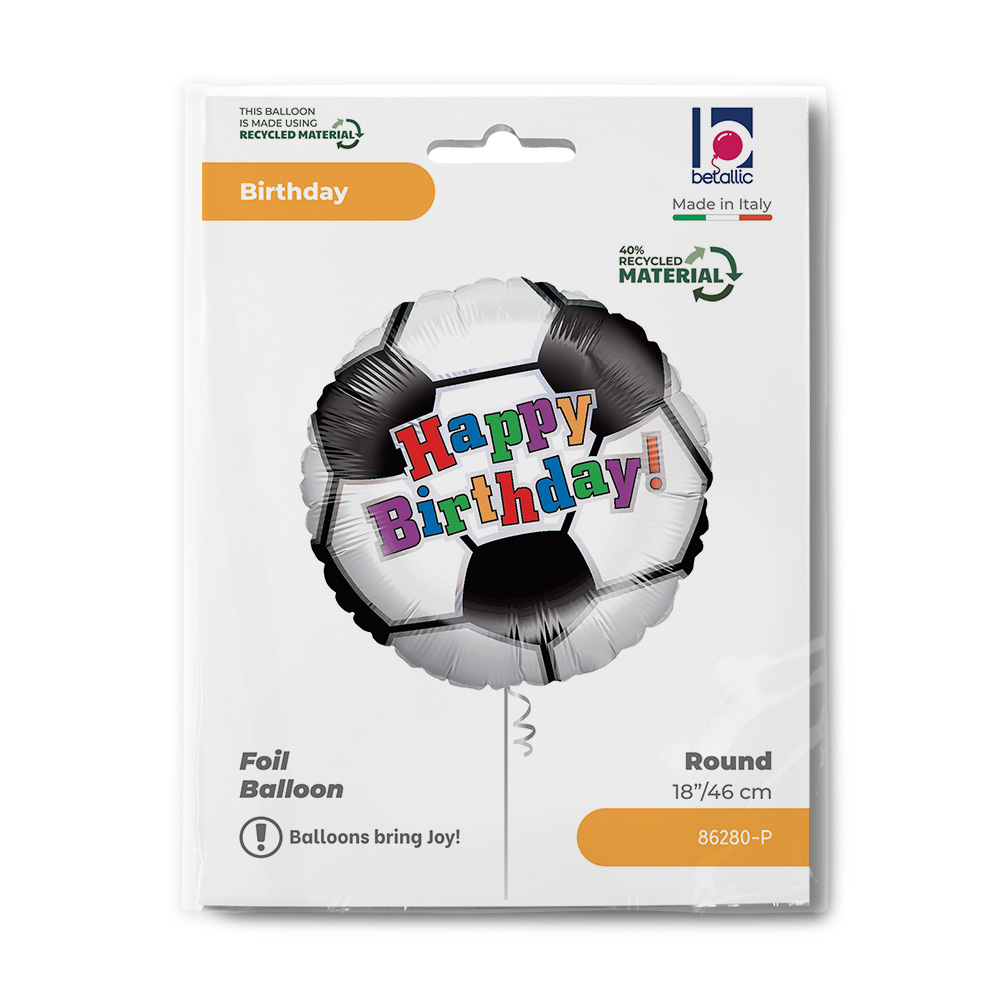 Fóliový balonek ve tvaru fotbalového míče s barevným nápisem Happy Birthday je perfektní volbou pro narozeninovou oslavu každého milovníka fotbalu. Klasický černo-bílý design doplněný hravým barevným textem působí výrazně a zábavně, takže skvěle oživí každou party výzdobu.