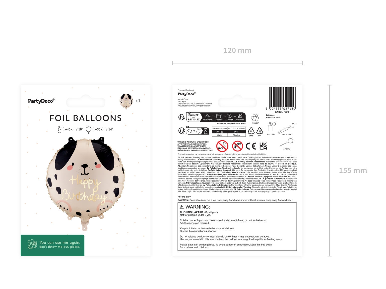 Technické parametry:Rozměry po nafouknutí: cca 35 × 35 cmRozměry před nafouknutím: cca 40 × 40 cmObjem: cca 15 lMateriál: metalická fólieBarva: mix barevNafukování: vzduch i héliumSamo uzávěr: AnoObchodní balení: AnoBalení: 1 ks