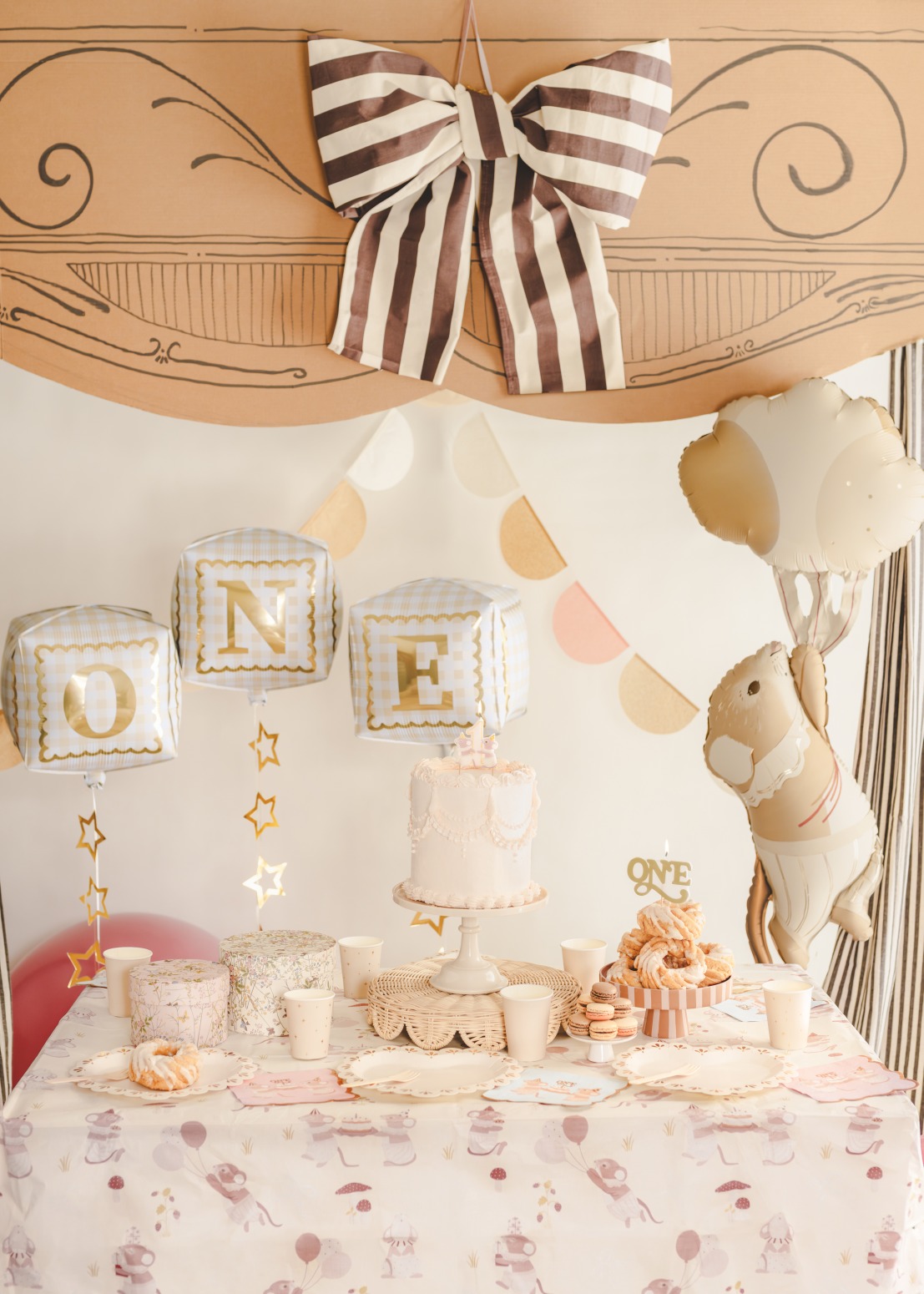 Balónek je skvělý jako dominantní prvek výzdoby vedle dortu, sladkého baru nebo jako součást balónkové kompozice v přírodních a zlatých barvách. Skvěle se kombinuje s balónky s číslem 1, pastelovými latexovými balónky i jemnou balónkovou girlandou.