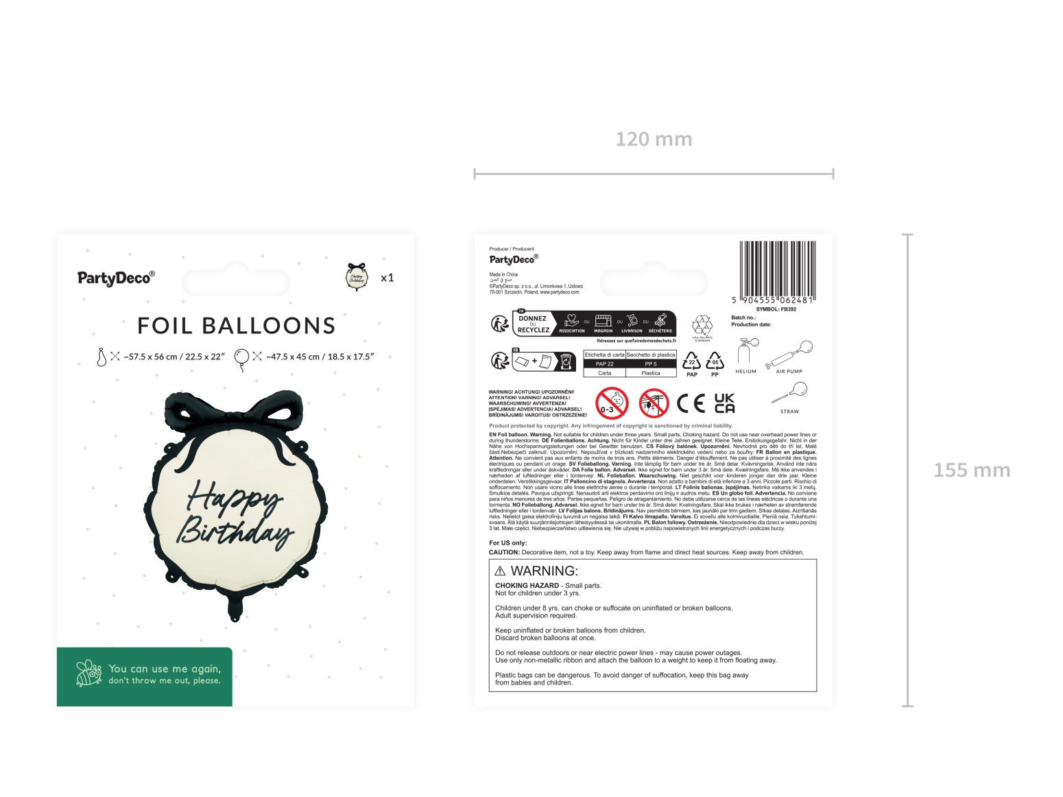 Fóliový balónek Happy Birthday v luxusním černo-krémovém provedení s výraznou mašlí dodá narozeninové oslavě elegantní a moderní vzhled. Díky decentní barevné kombinaci je ideální pro oslavu 18. narozenin, narozeninovou party pro dospělé i stylovou dámskou oslavu.