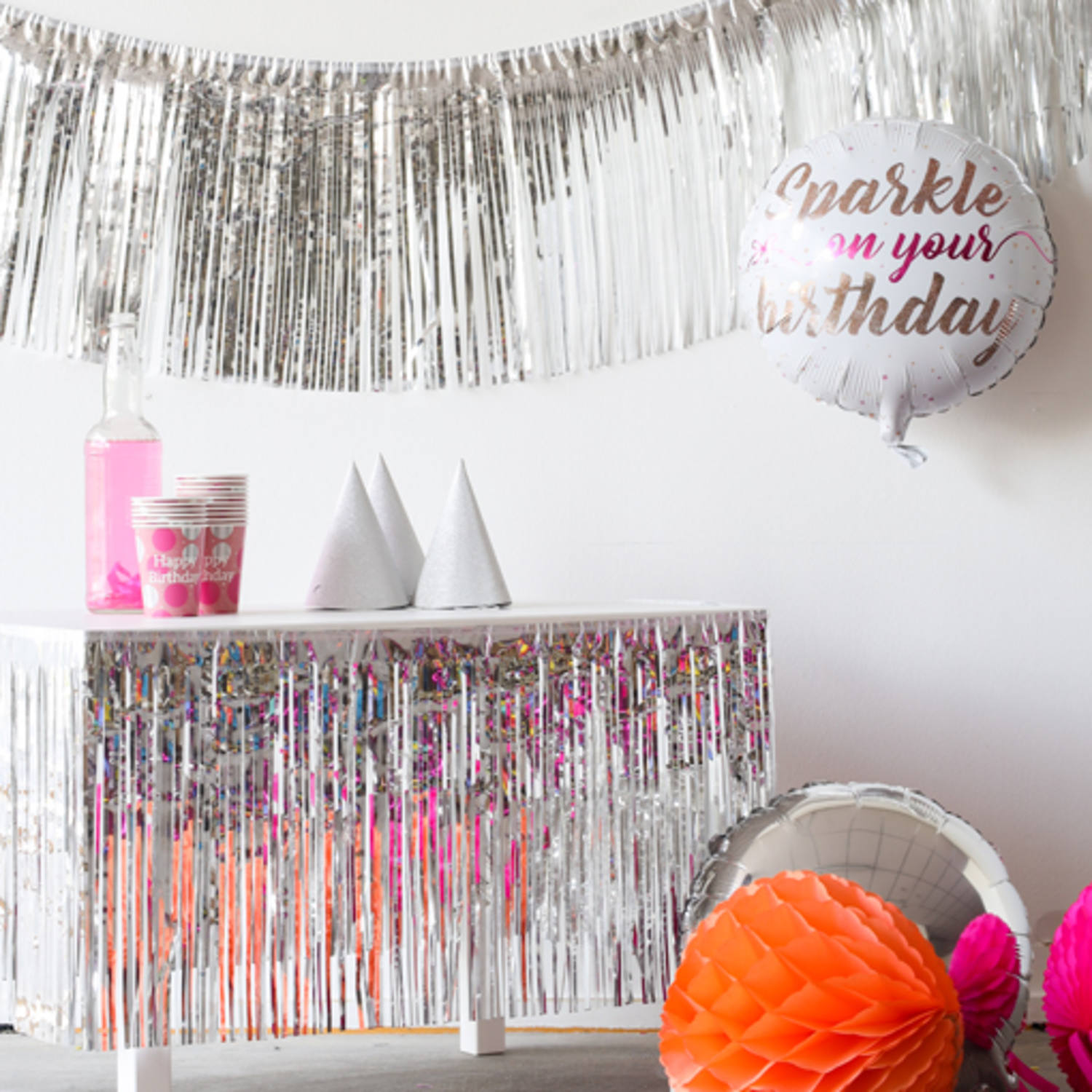 Lesklá girlanda se stříbrnými střapci o délce 150 cm je ideální pro narozeninové oslavy, Silvestr, svatby či tematické večírky. Skvělý doplněk pro slavnostní výzdobu.