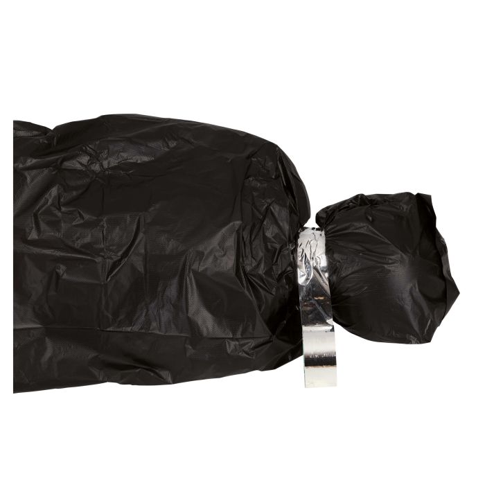 Mrtvola v pytli je dodávána v rozloženém stavu. Pomocí pupičky nafouknete umělého panáka a pomocí lepící pásky ho zamotáte do igelitového pytle.
