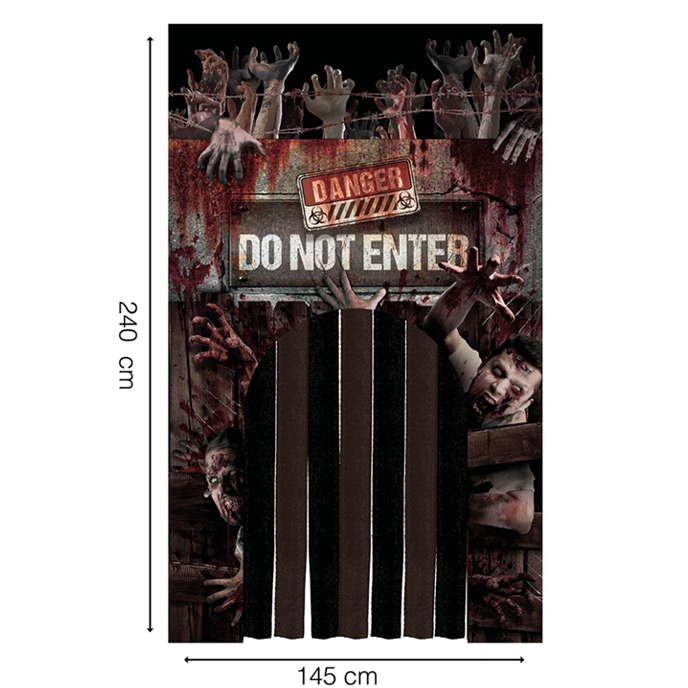 Halloweenská dekorace na dveře se závěsem - Zombie. Tato dekorace je vhodná na halloweenský večer nebo jinou strašidelnou akci. Dodá vašemu vstupu temnou a tajuplnou atmosféru.