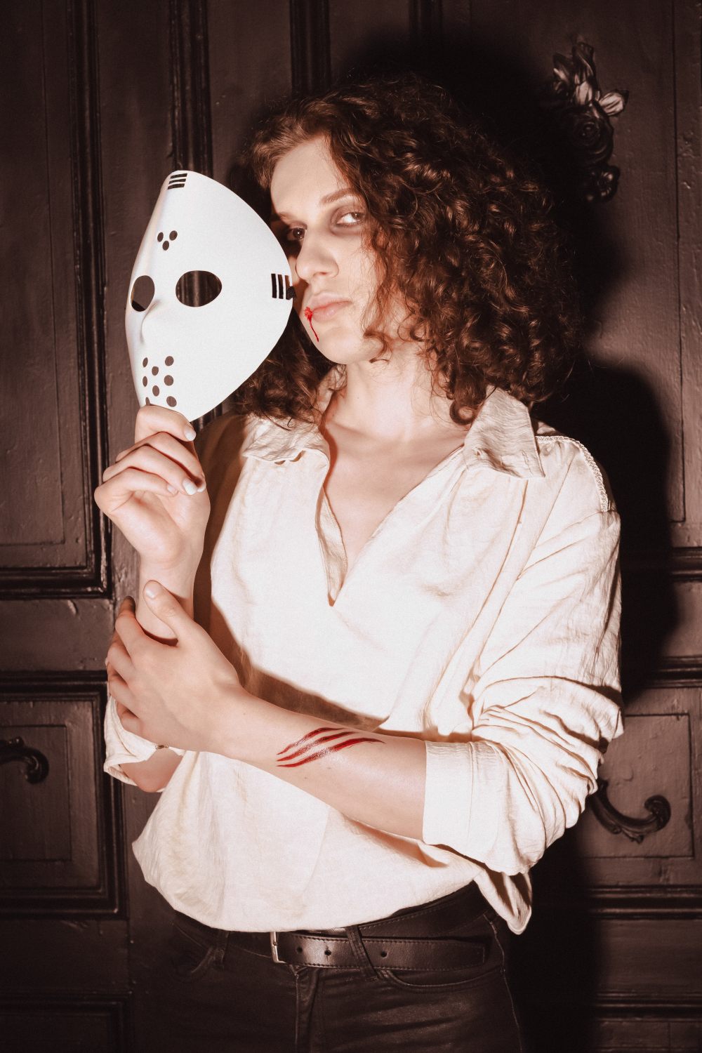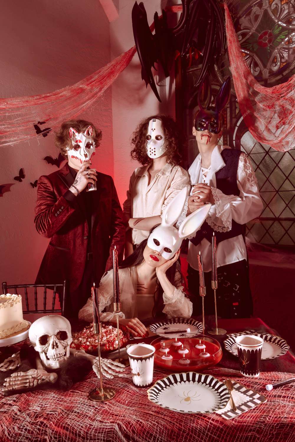 Polomaska ve tvaru lebky s krvavými tesáky dodá každému halloweenskému kostýmu pořádnou dávku hrůzy. Ideální pro hororové večírky, focení i strašidelné efekty.
