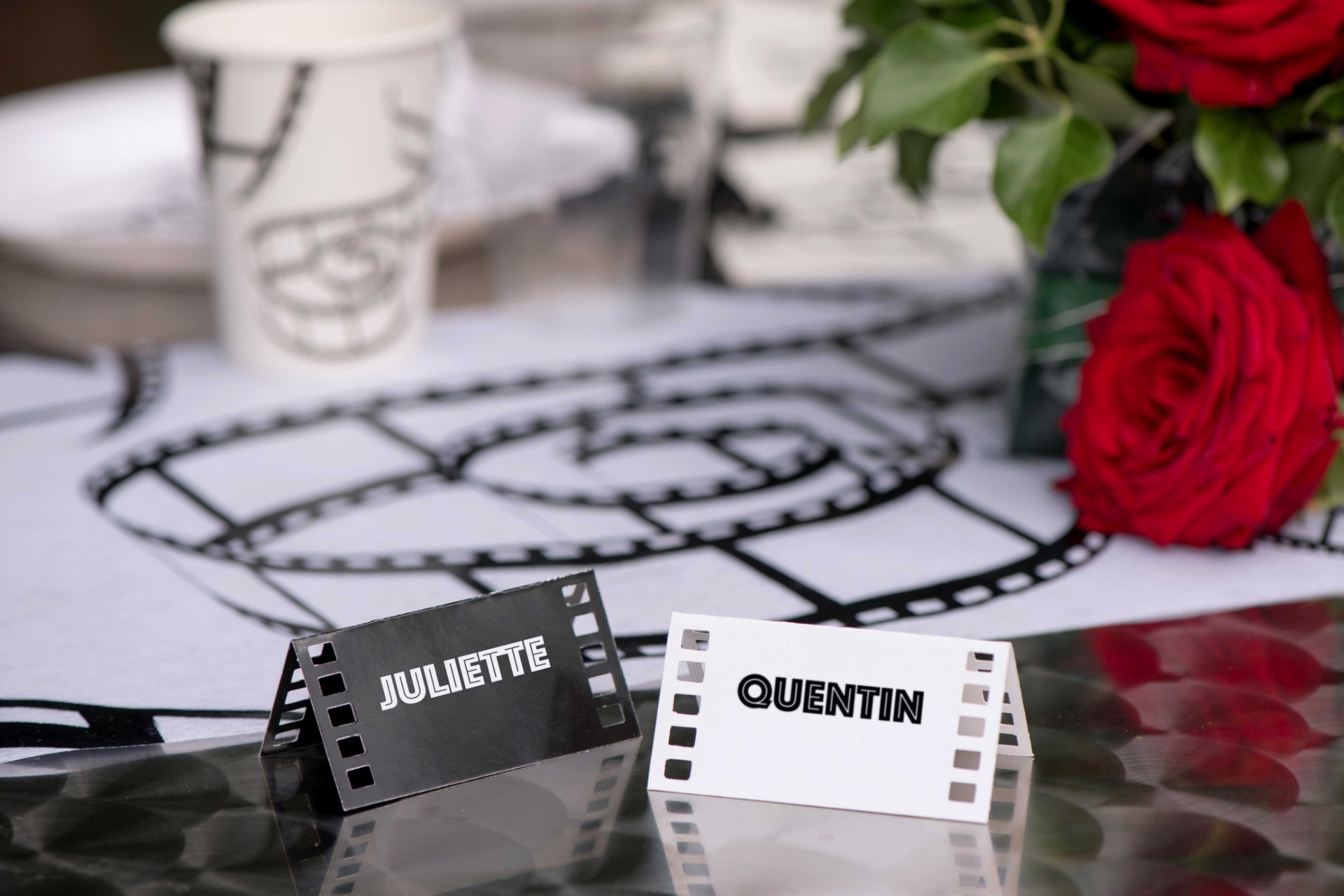 Každá jmenovka má tvar přehnuté karty a boční perforaci připomínající filmový pás, což z ní dělá nejen praktický, ale i dekorační prvek. Místo na jméno hosta lze popsat běžným perem či fixem. Skvěle ladí s dalšími doplňky ve filmové kolekci – jako jsou kelímky, ubrousky nebo šerpy.