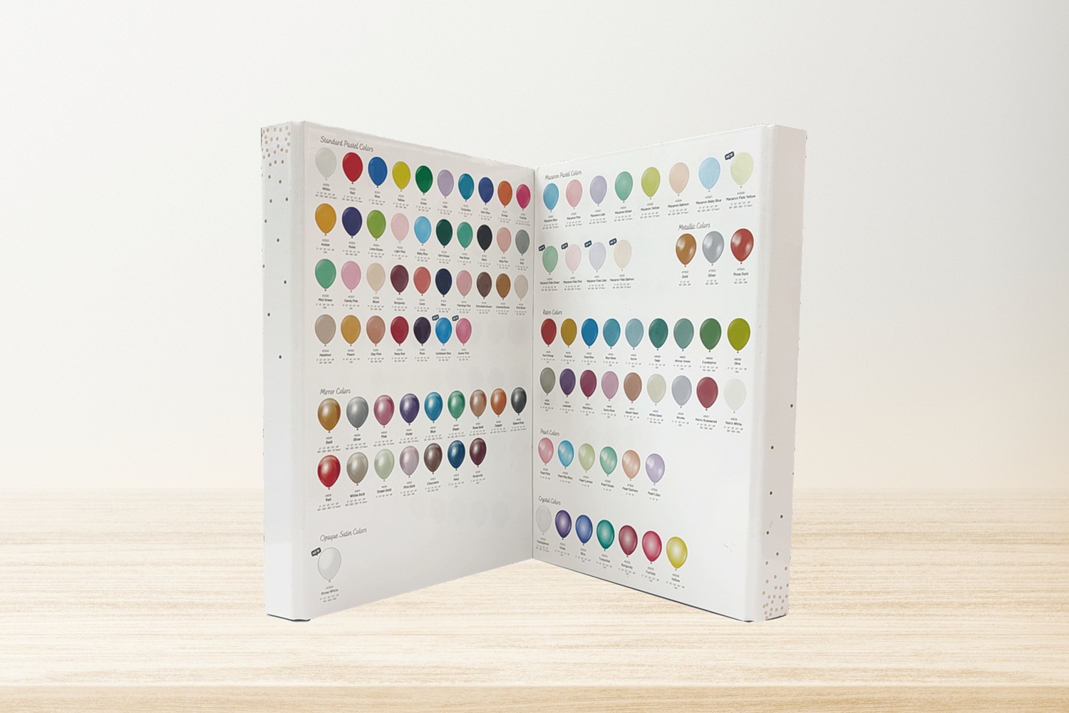 Kalisan Color Book je oficiální vzorník barev balónků, který zahrnuje kompletní nabídku odstínů značky Kalisan – od standardních a pastelových, přes metalické, macaron, retro až po chromové a crystal varianty.