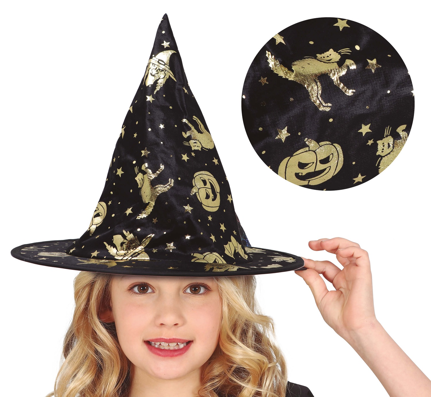 Čarodějnický klobouk v černé barvě se zlatým potiskem je dokonalým doplňkem pro Halloween, karnevalové kostýmy nebo tematické párty. Díky výraznému designu se zlatými motivy koček, hvězd a čarodějnic působí efektně a okamžitě upoutá pozornost. Klobouk je lehký, pohodlný na nošení a snadno se kombinuje s čarodějnickými šaty, pláštěm nebo make-upem. Skvěle se hodí pro děti i dospělé, kteří chtějí svému kostýmu dodat ten pravý kouzelný nádech.