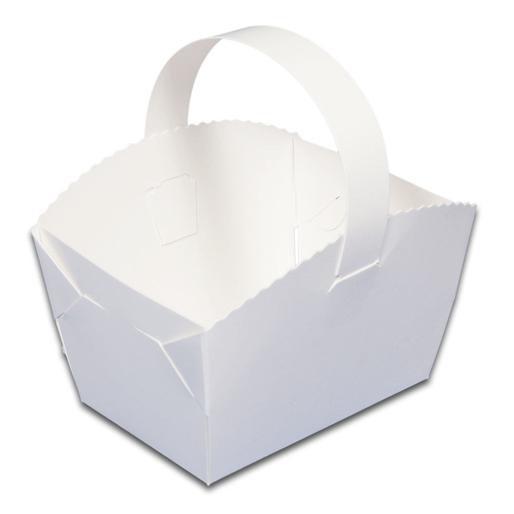 Košíček na svatební výslužku vyrobený u bílého kartonu, vhodná například na koláčky, drobné chuťovky či svatební pečivo. Hodí se na všechny příležitosti, jako jsou svatby, firemní večírky nebo oslavy narozenin.