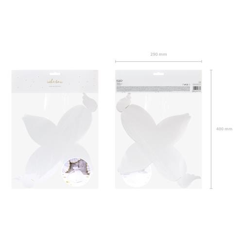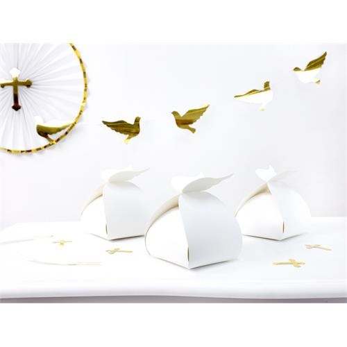 Bílá papírová krabička na výslužku se zaoblenými tvary a křídly, vhodná například na svatební cukrovinky nebo malý dáreček. Další možností je využít krabičku při dekoraci jako podstavec apod. Hodí se na všechny příležitosti, jako jsou svatby, firemní večírky nebo oslavy narozenin.
