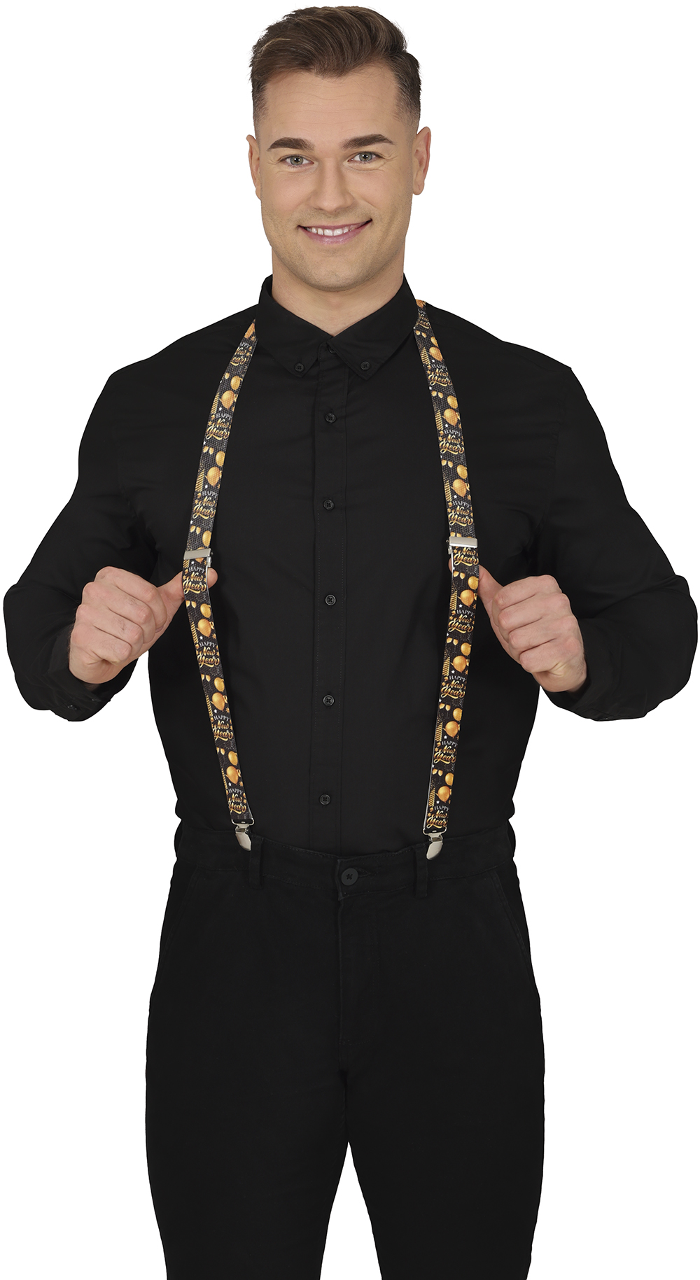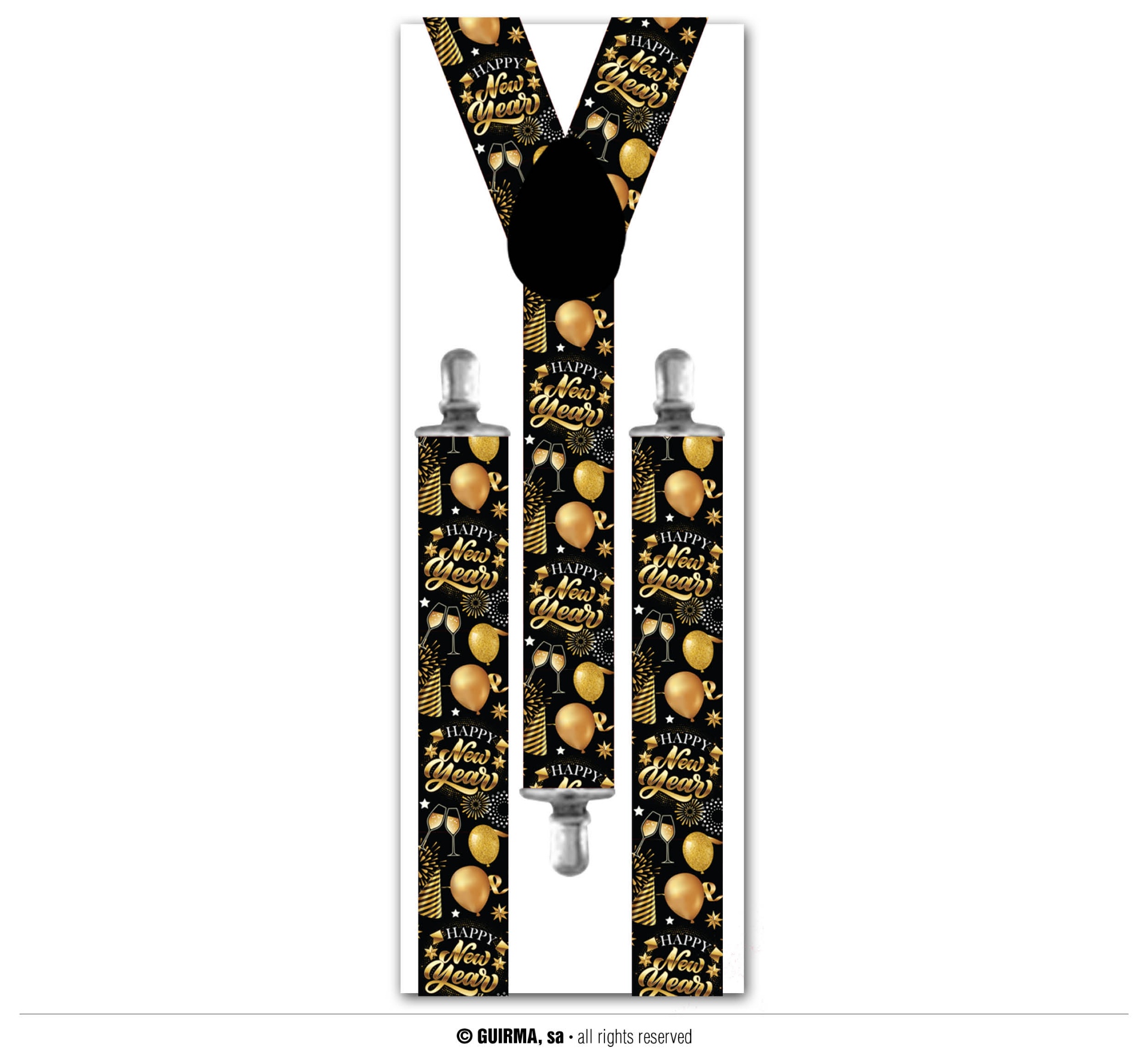 Stylové kšandy (šle) s tematickým potiskem pro oslavu nového roku Happy New Year, vhodné jako univerzální doplněk pro Silvestrovskou party. Je to skvělý doplněk například pro barmany a číšníky, které neomezuje v pohybu a prostě ladí. Stačí doplnit stylovou košilí a je hotovo. Kšandy se zapínají pomocí cvočků.