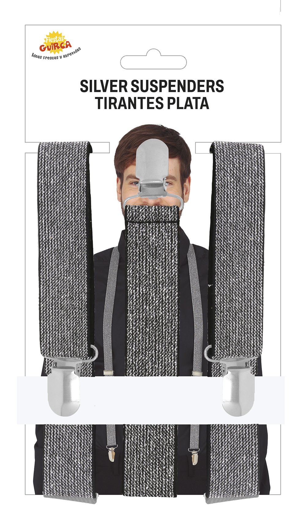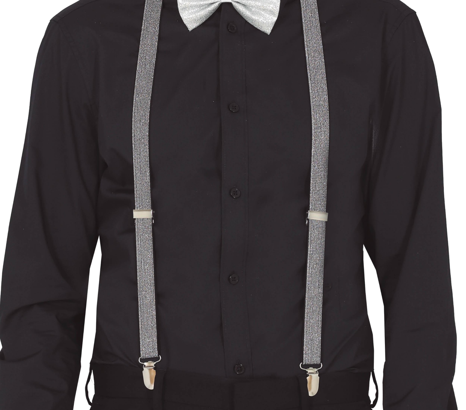 Stříbrné kšandy (šle) vhodné jako univerzální doplněk nejen ke kostýmu mafiána nebo tanečníka. Skvěle se hodí i na běžné nošení, nebo jako doplněk pro Vánoční nebo silvestrovskou party. Stačí doplnit stylovou košilí a je hotovo. Kšandy se zapínají pomocí cvočků.