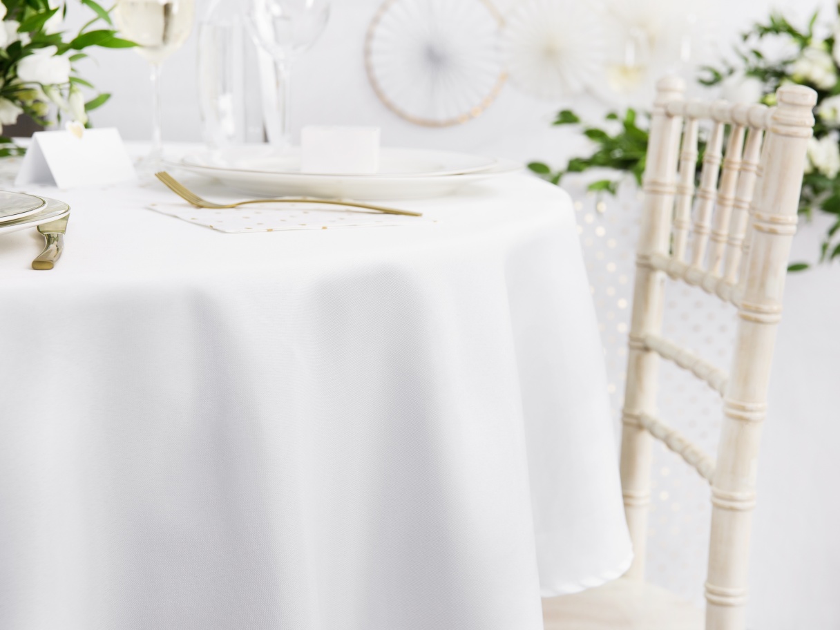 Bílý obdélníkový ubrus pro slavnostní příležitosti 180 x 300 cm, odolný proti skvrnám. Hodí se na svatební hostinu, vánoce ale i na firemní večírky nebo akce, kde chcete oslnit.
