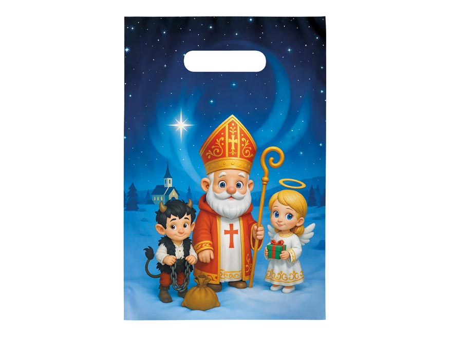 Vneste do svátečního období kouzlo tradiční mikulášské nadílky s originální mikulášskou dárkovou taškou MFP. Barevný motiv Mikuláše, anděla a čerta na zimním pozadí pod hvězdnou oblohou vytvoří radostnou atmosféru a rozzáří každý dárek.