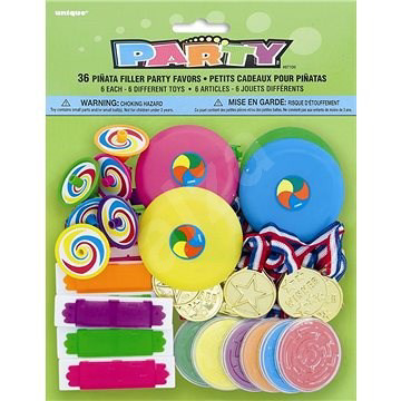 Barevný mix 36 drobných hraček jako placky, joja, medaile, bludiště a píšťalky – ideální náplň do piñaty, dárečků na dětskou oslavu nebo odměny za soutěže. Skvělá zábava pro děti od 3 let.