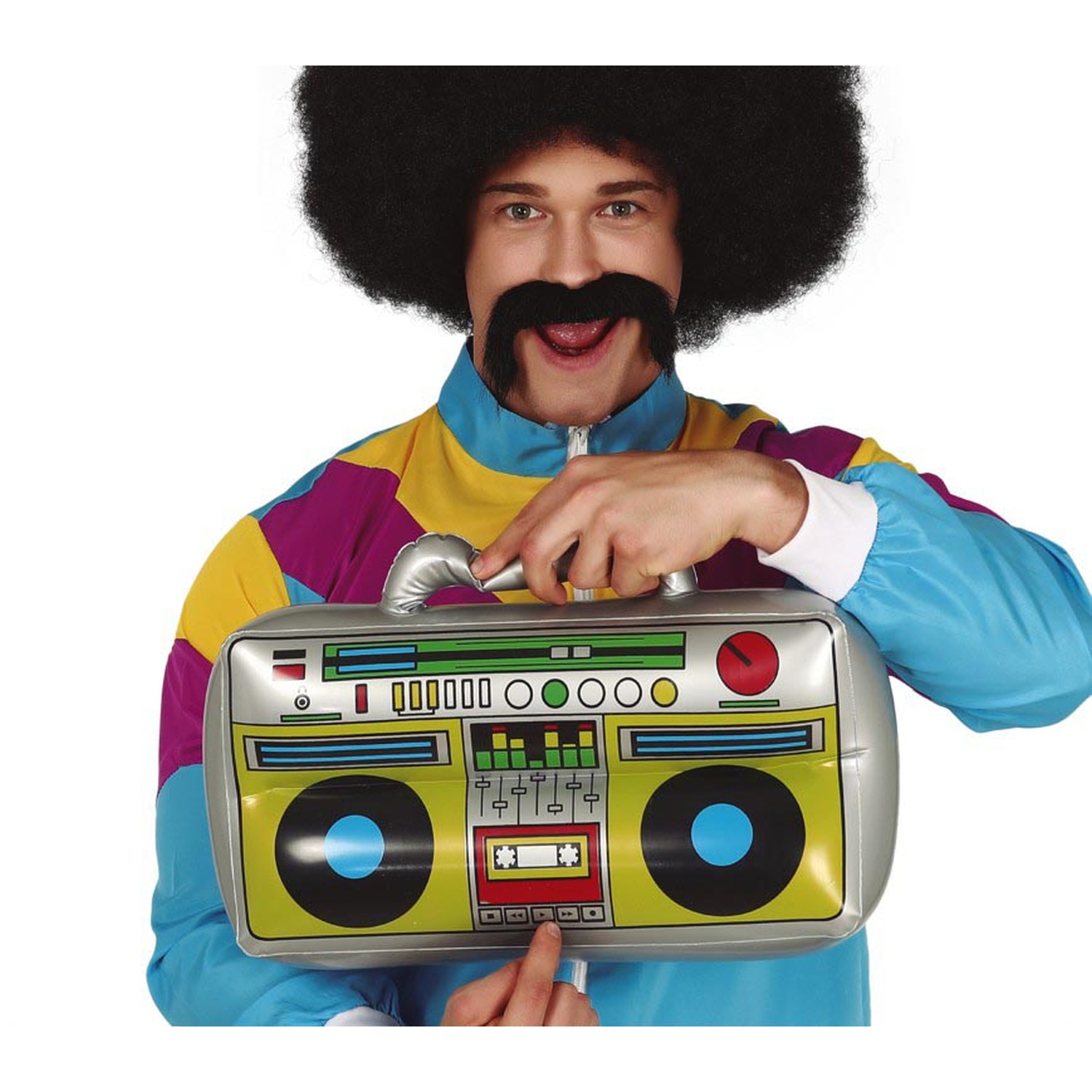 Produkt simuluje estetiku klasického boomboxu, čímž představuje výrazný vizuální prvek s nostalgickým odkazem na 80. léta. Jeho rozměry 40 x 20 cm zajišťují dostatečnou viditelnost při použití jako dekorace na tematických večírcích, foceních nebo jako rekvizita v divadelních či filmových produkcích. Specifický design inspirovaný světovými kulturami dále rozšiřuje jeho univerzální použitelnost v různých kontextech a událostech, od karnevalů po firemní akce.