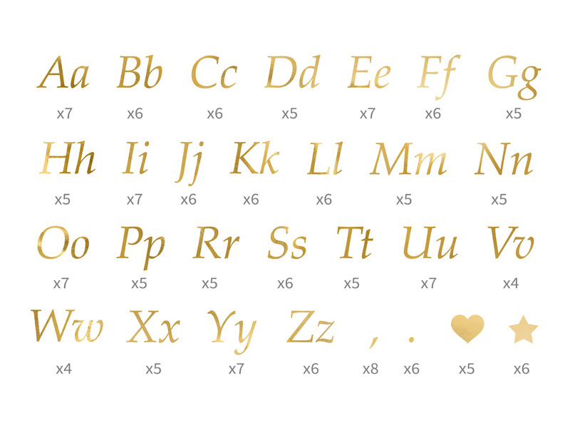 Balení obsahuje 7x písmeno A, E, I, O, U, Y, 6x písmeno B, C, F, J, K, L, S, Z, 5x písmeno D, G, H, M, N, P, R, T, X, 4x písmeno W, V. Dále 5 srdcí, 8 čárek , 6 teček a 6 hvězd.