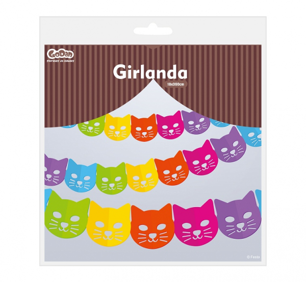 Girlanda se vzorem kočiček vhodná jako dekorace na jakoukoliv party nebo oslavu. Protože je girlanda papírová, můžete si ji dozdobit textem či různými motivy.