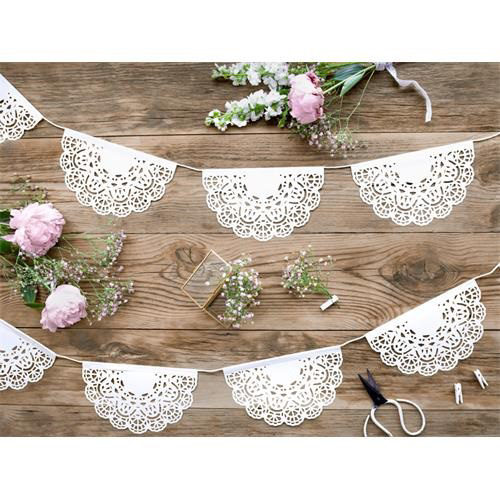 Papírová závěsná girlanda s krajkovým vzorem v perleťové bílé barvě vhodná jako neutrální výzdoba na svatební dekorace k dalším produktům.