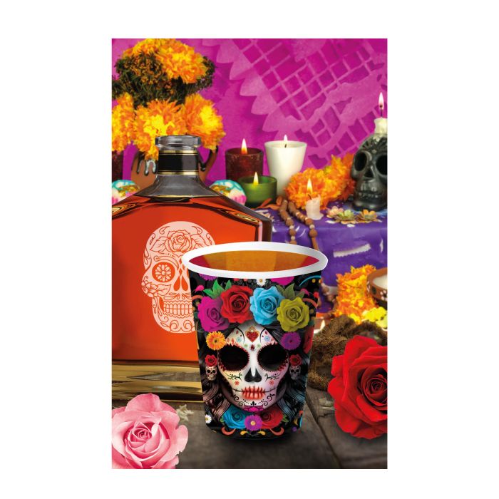 Papírové kelímky Day of the dead 6 ks. Papírové kelímky na Halloweenskou party s motivem Dia de los Muertos. Po oslavě stačí kelímky vzít a vyhodit. Skvěle také doladí vaši strašidelnou dekoraci a výzdobu.