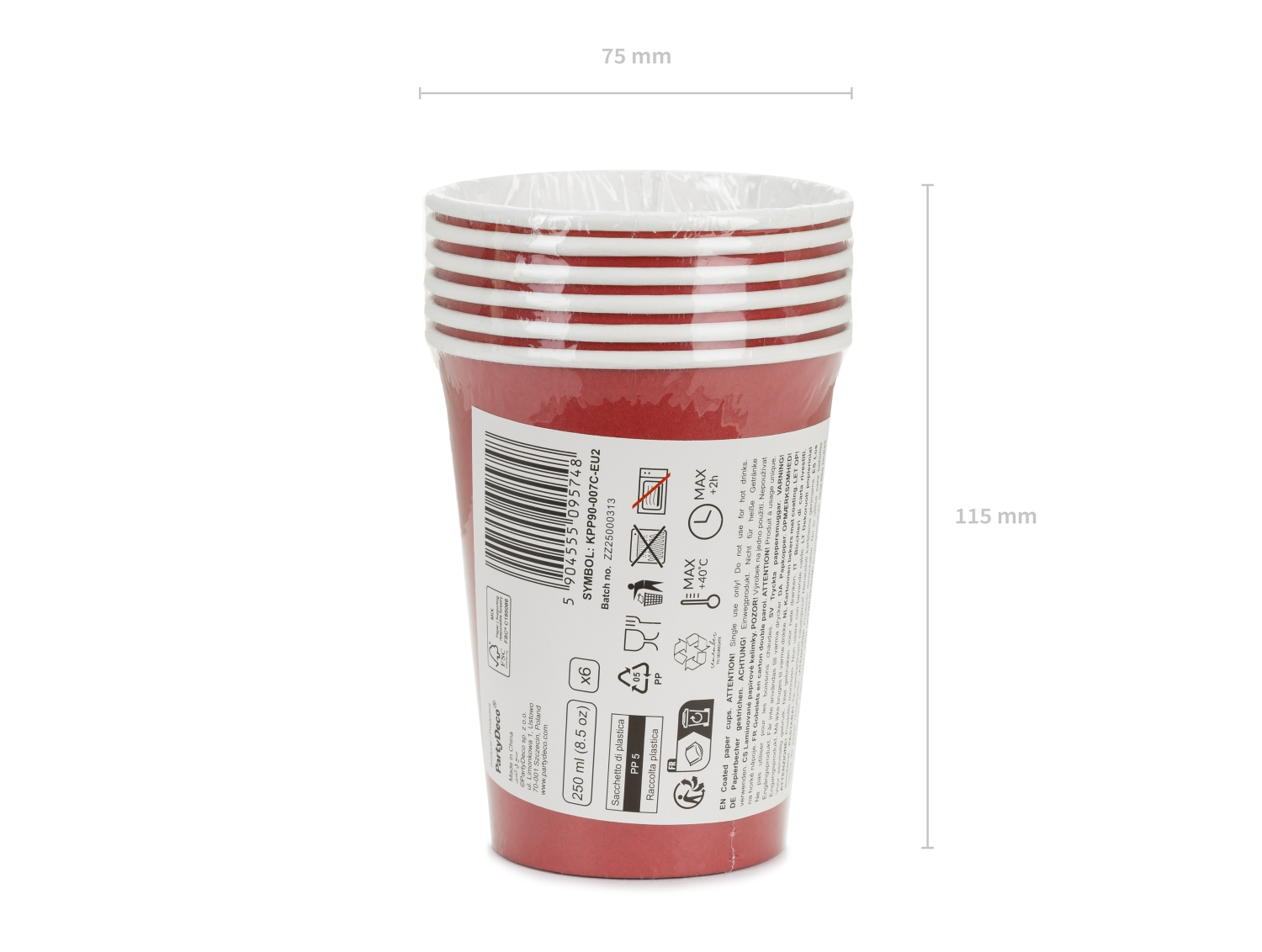 Tmavě červené papírové kelímky o objemu 250 ml jsou skvělým doplňkem na narozeniny, svatby, firemní večírky, vánoční či valentýnské oslavy. Určené na studené nápoje, jednorázové a splňují povinné označení dle nařízení EU 2020/2151.