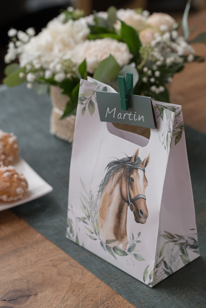 Papírové party tašky s motivem koní jsou perfektním doplňkem pro oslavy narozenin nebo party. Balení obsahuje 10 tašek, které jsou zdobené obrázky koní. Tašky jsou vyrobené z kvalitního a pevného papíru, což zaručuje jejich odolnost. Jsou ideální pro balení dárků pro malé hosty nebo pro balení zbytků jídla.