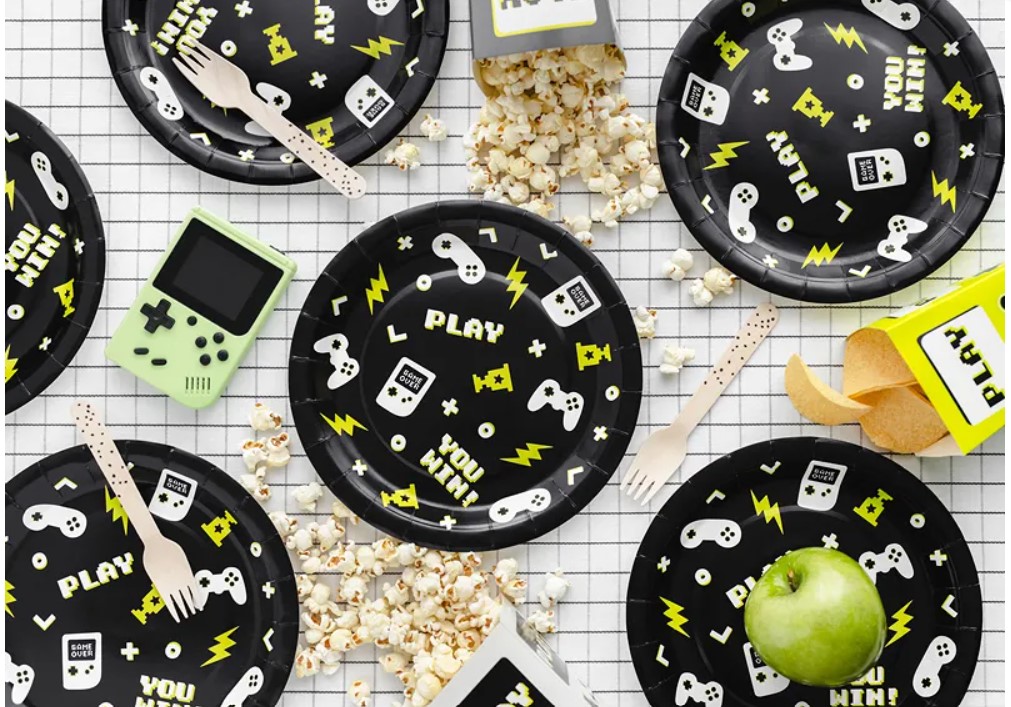 Papírové talíře Game play s potiskem retro her, budou nepostradatelným doplňkem každé oslavy narozenin, tematické party nebo zahradní oslavy s grilováním. Jsou také velmi praktické, talíře po použití jednoduše ekologicky zlikvidujete, bez nutnosti mytí.