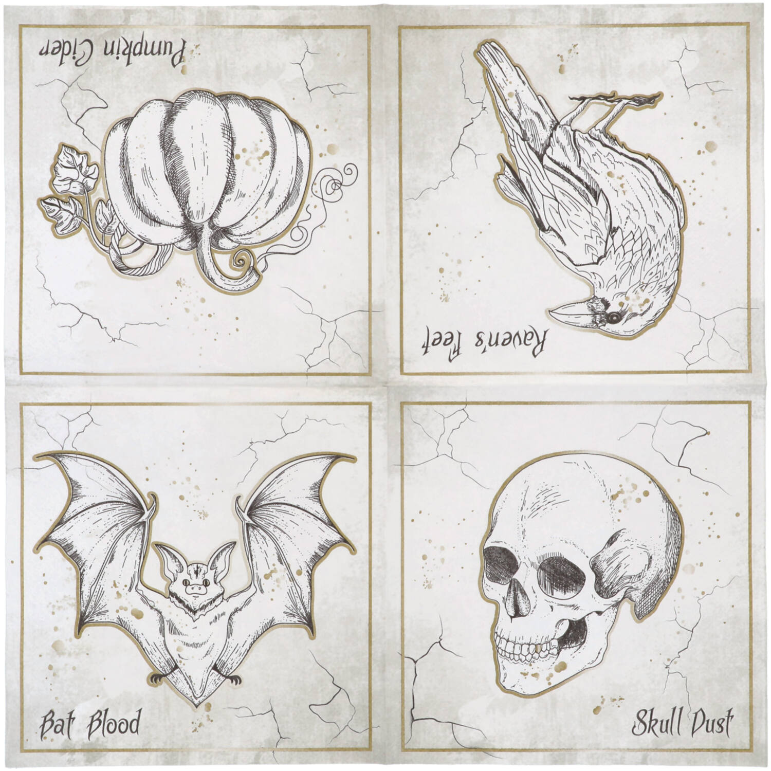 Papírové ubrousky Creepy Halloween 33 x 33 cm, 20 ks. Papírové ubrousky na Halloweenský večer s motivem havrana, lebky, dýně a netopýra. Po oslavě stačí ubrousky vzít a vyhodit. Skvěle také doladí vaši strašidelnou dekoraci a výzdobu.