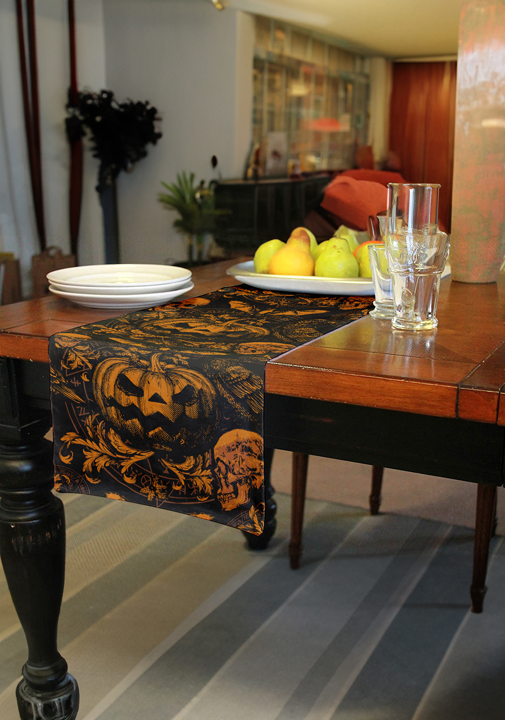 Stylový papírový běhoun na stůl Gothic Pumpkin o rozměrech 275 x 28 cm. Elegantní černo-oranžový design s dýněmi a lebkami dodá halloweenskému stolování temnou gotickou atmosféru.