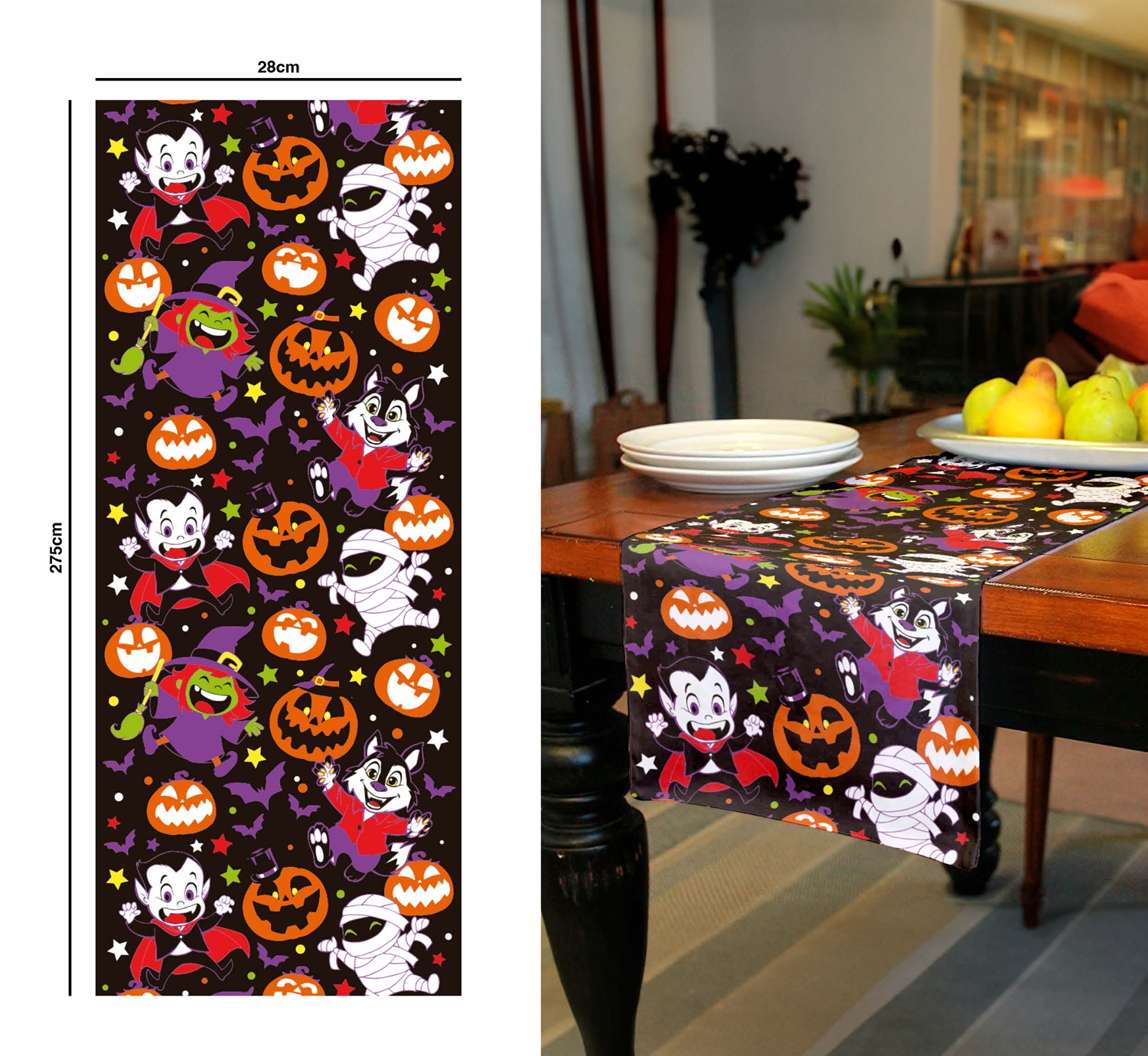 Barva: Černý podklad, barevný potisk (dýně, příšerky, čarodějnice, mumie)
