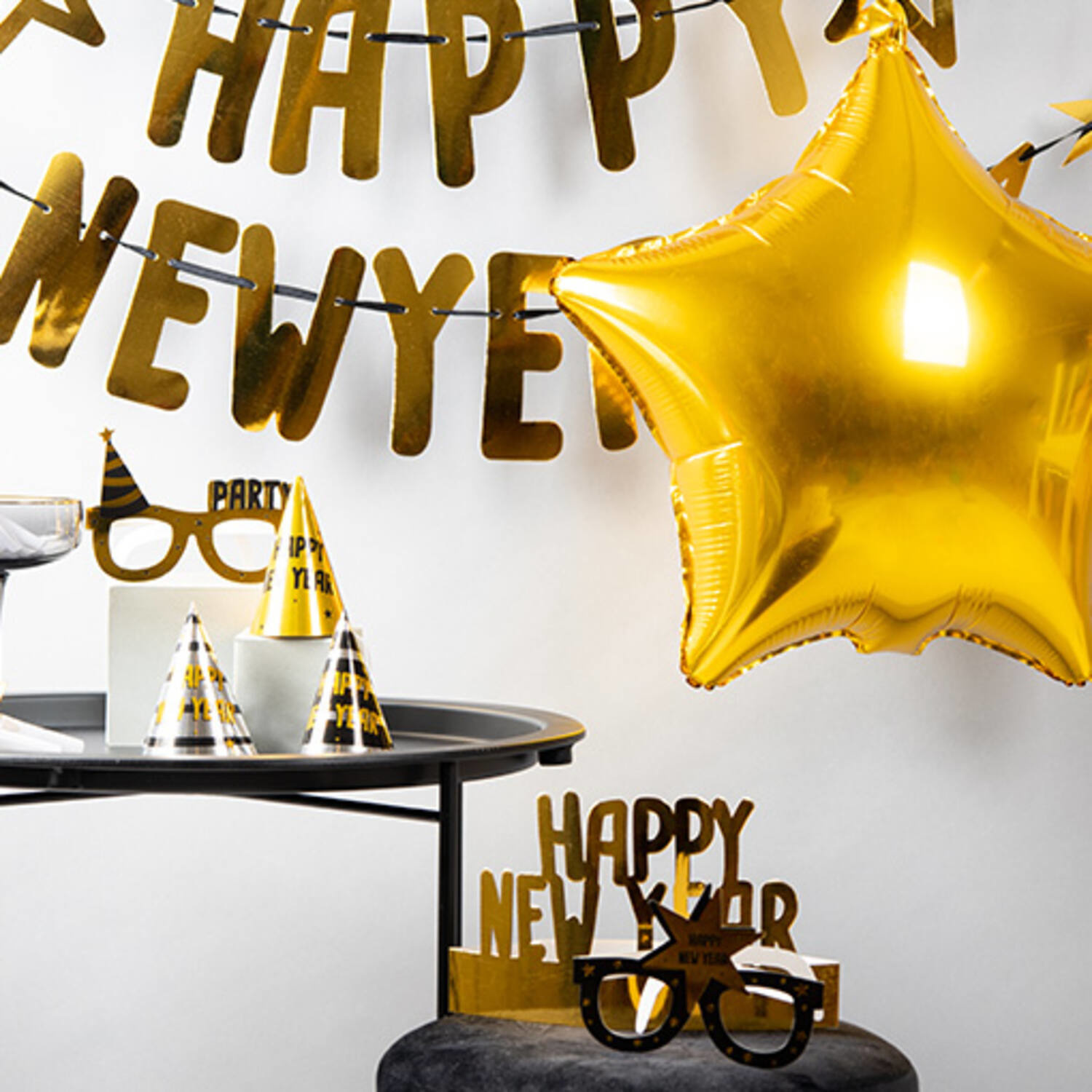 V balení naleznete: 1x nápis k zavěšení "Happy" a 1 x "New Year", 6x čepička, 6x papírová čelenka, 6x papírové brýle, 6x frkačky, 2x foliový balonek ve tvaru hvězdy