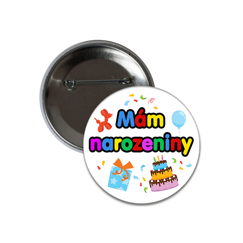 Super placka se špendlíkem, opatřená barevným potiskem, díky kterému rozhodně nepřehlédnete oslavence. Placka se hodí jako dáreček k narozeninám každého věku a je zdobená velkým nápisem Mám narozeniny, společně s obrázky k narozeninové tématice. Velikost 5,8 mm