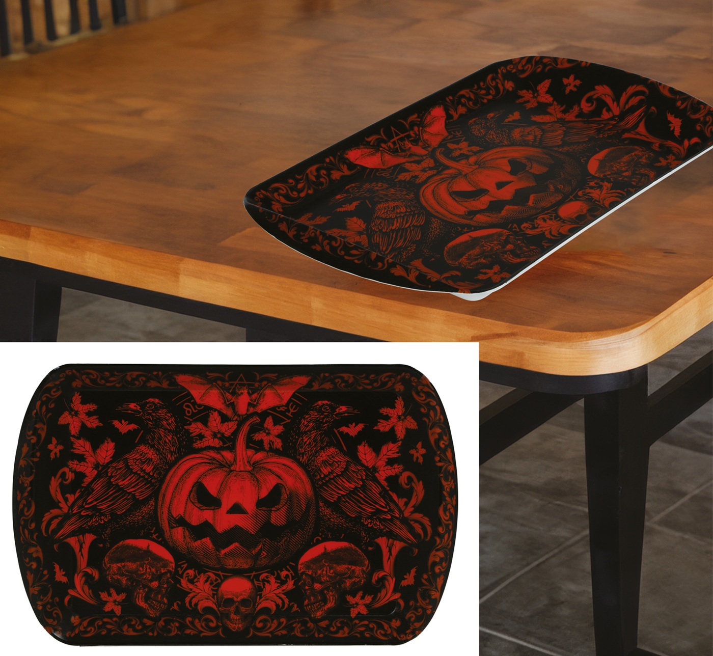 Plastový podnos Gothic Pumpkin s rozměry 39 x 24 cm dodá vašemu stolování na Halloween tajemnou a strašidelnou atmosféru. Motiv červené dýně s hrozivým výrazem doplňují havrani, netopýr a lebky na černém pozadí, což vytváří temný gotický vzhled. Podnos je praktický pro servírování sladkostí, drinků, jednohubek nebo dalších dobrot a zároveň působí jako působivý dekorační prvek. Díky odolnému plastu je lehký, snadno omyvatelný a připravený k opakovanému použití. Perfektně se hodí do kombinace s miskami, talíři či kelímky ze stejné halloweenské série Gothic Pumpkin.