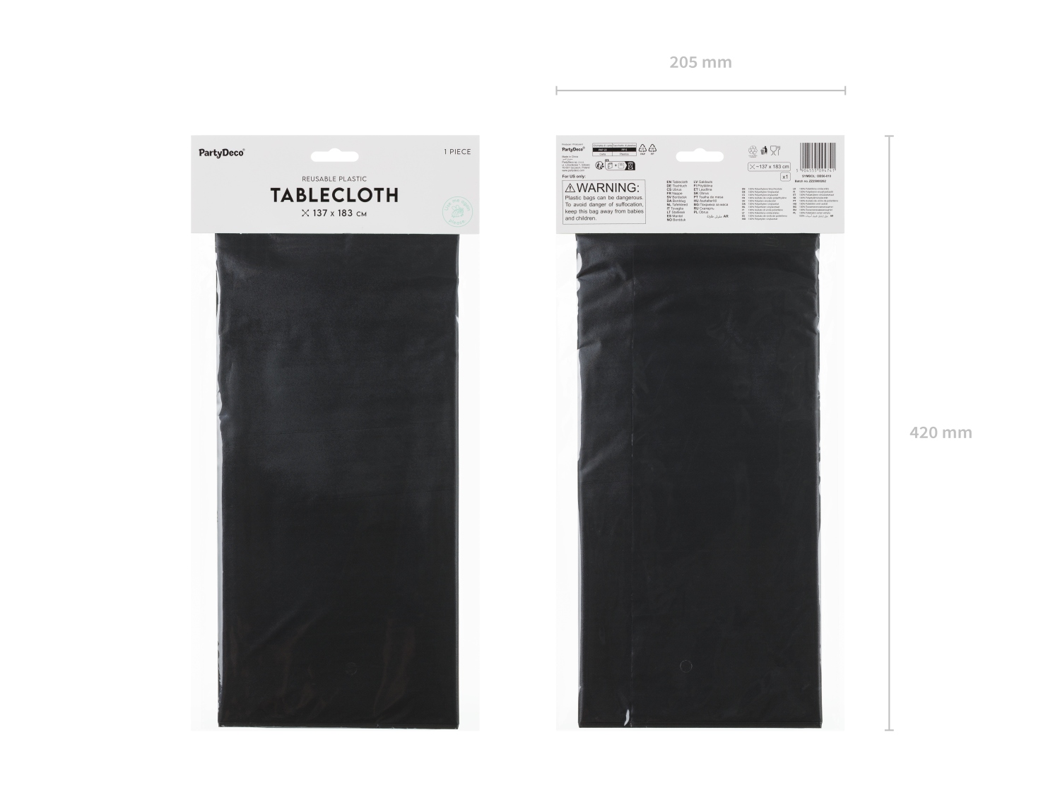 Černý plastový ubrus o velikosti 137 × 183 cm. Praktický, omyvatelný a opakovaně použitelný doplněk pro oslavy, svatby, večírky či firemní akce.