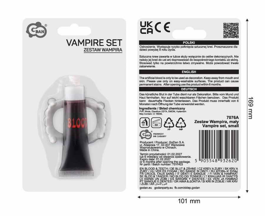 Vytvořte si děsivý upíří look s touto sadou upíra, která obsahuje umělé zuby a tubu s umělou krví. Perfektní doplněk pro Halloween, strašidelný večírek nebo tematické focení.