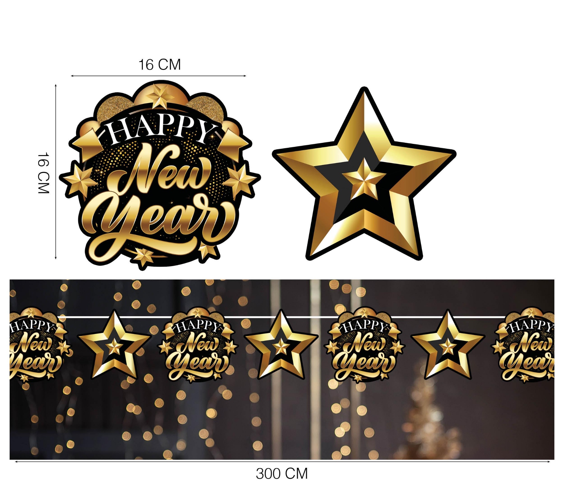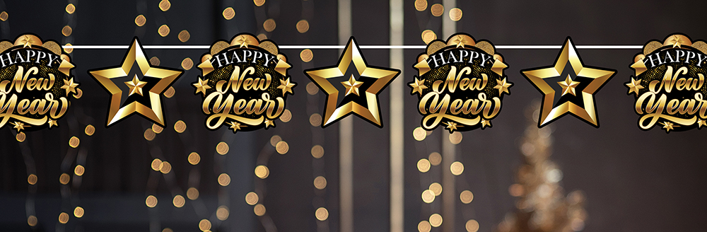 Papírová girlanda na Silvestrovskou párty s nápisy Happy New Year a zlatými hvězdami. Je již sestavená a stačí jí zavěsit do vzduchu, na zeď nebo nad barový pult. Silvestrovská dekorace nebyla nikdy tak jednoduchá.