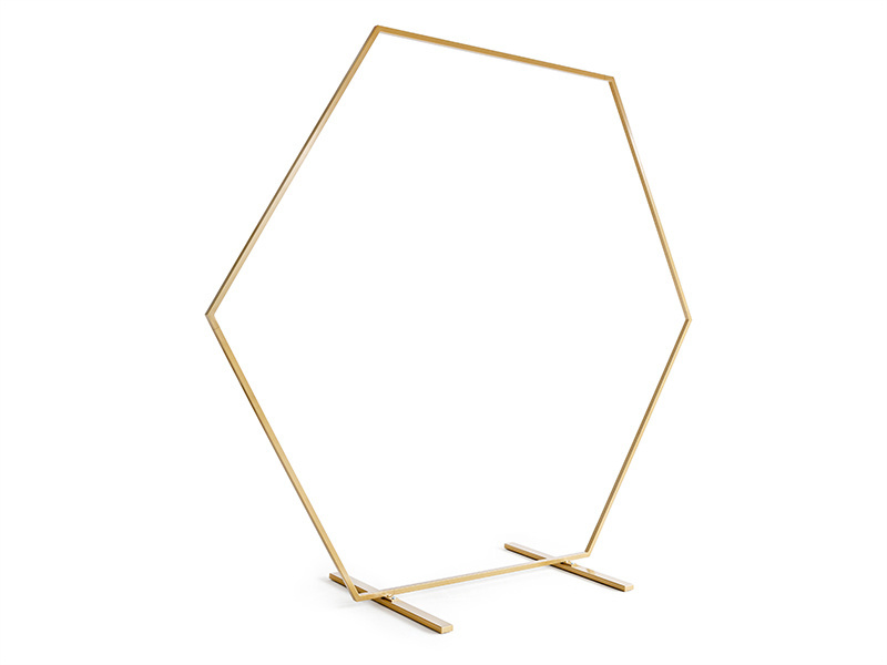 Samovolně stojící slavobrána ve tvaru hexagonu, vyrobena z kovu ve zlaté barvě. Průměr konstrukce po sestavení je cca 2 metry. Svatební brána, nádherný prvek při svatebním obřadu, který přidá hodnotu na vaší svatbě. Lze použít i jako pozadí ve fotokoutku. S květinovou dekorací snadno vytvoříte svatební Boho styl. Výrobek se snadno skládá, po složení má stabilní konstrukci. Jedná se o kvalitní produkt Evropského původu. INFORMACE A PODMÍNKY ZAPŮJČENÍ NALEZNETE V POPISU NÍŽE.