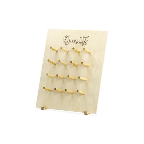 Má moderní rustikální vzhled, je vyroben z přírodního dřeva. Dřevěná stěna je celkem pro zavěšení 18ks donutů a je určena pro vlastní montáž.
