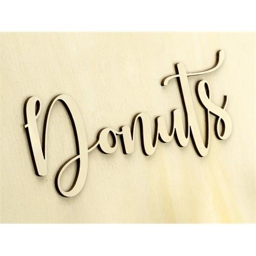 Dřevěný stojan na pověšení donutů s ozdobným nápisem Donuts.
