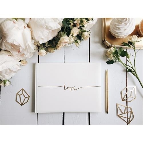Elegantní svatební kniha hostů v bílé barvě se zlatým nápisem Love. Krásný doplněk, do kterého vám hosté mohou napsat svá přání a vzpomínky. Obsahuje 22 stran.