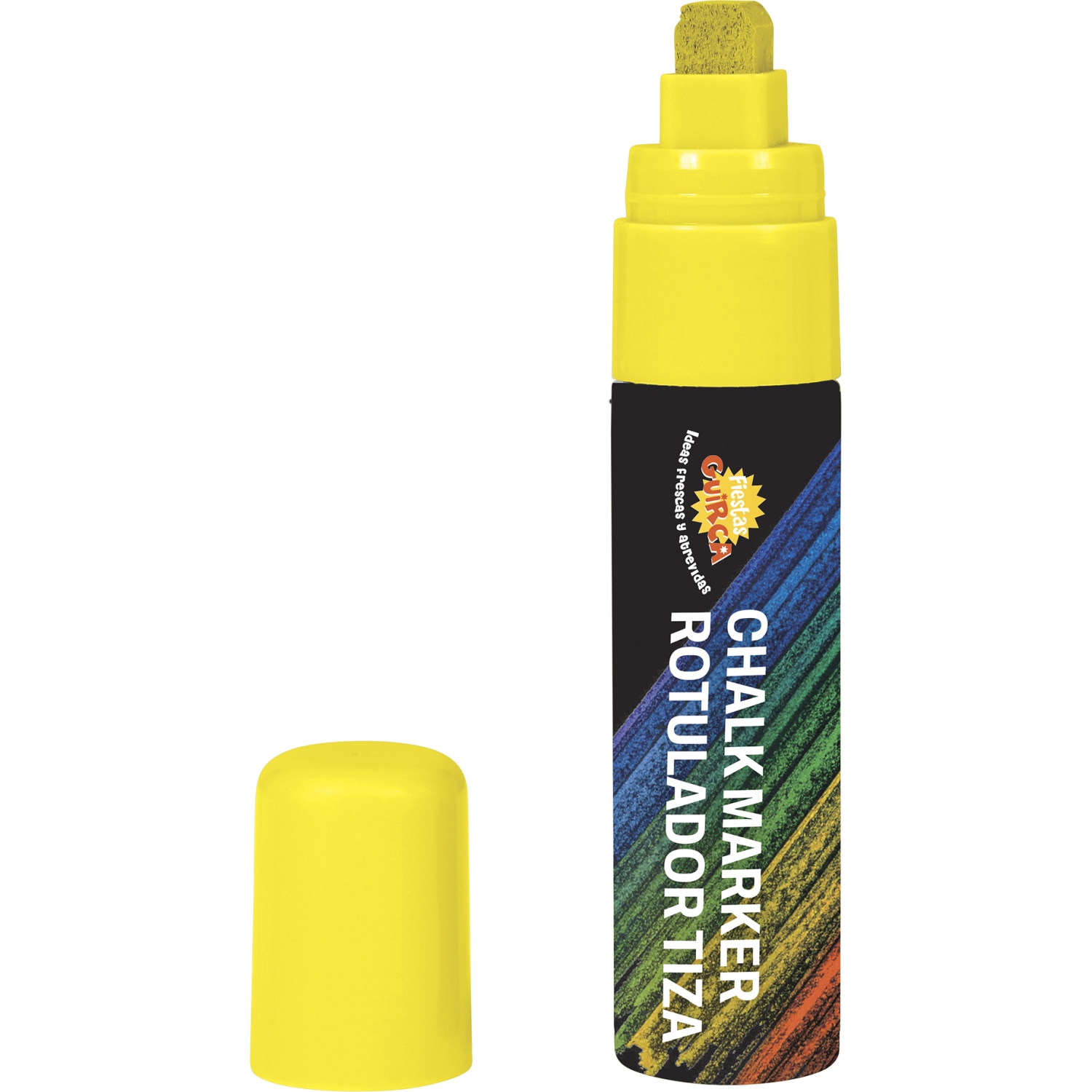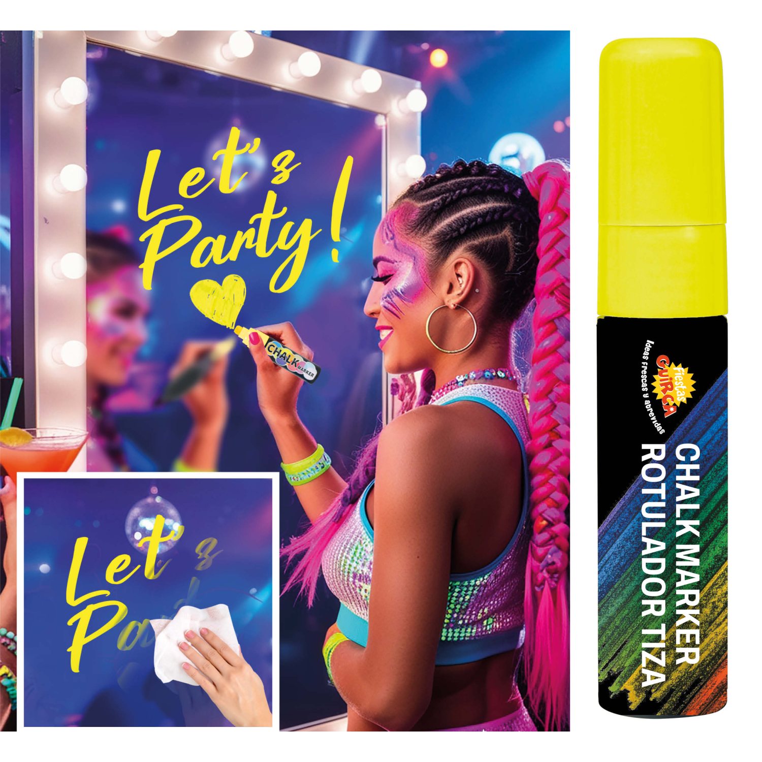 Žlutý popisovač s tekutou křídou je skvělým pomocníkem pro tvorbu výrazných nápisů na křídových tabulích, skle, výlohách nebo zrcadlech. Sytá barva krásně vynikne na tmavém podkladu a dodá vaší dekoraci energii a svěžest.