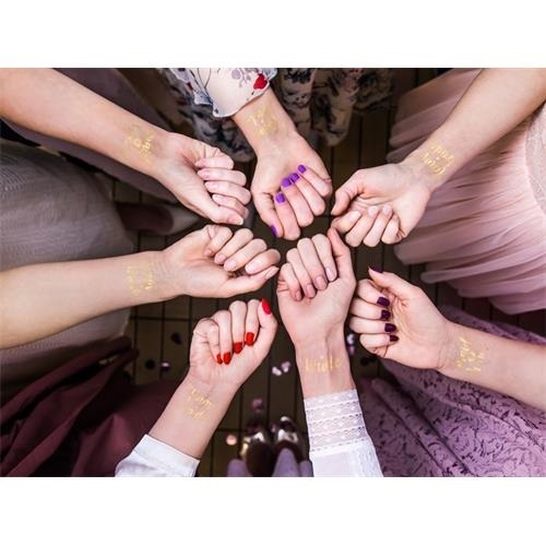 Tetování ve zlaté barvě pro celý tým nevěsty, vhodný na rozlučku se svobodou. Balení obsahuje 2x nápis Bride, 2x maid of honor a 9x team bride. Tímto jednoduchým party doplňkem, dotáhnete každou oslavu k dokonalosti.