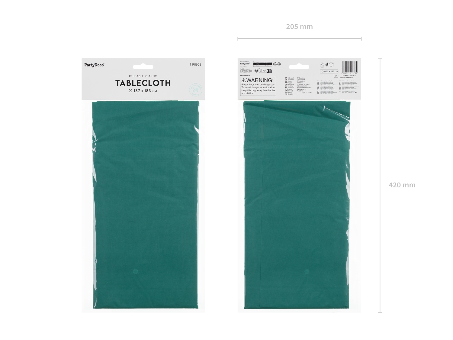 Tmavě zelený ubrus o rozměru 137 × 183 cm je odolný, omyvatelný a opakovaně použitelný. Elegantní barva se hodí na svatby, vánoční oslavy, narozeniny i zahradní party.